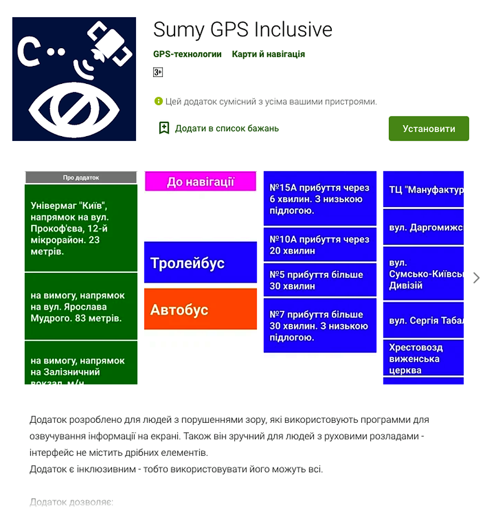 Зручну послугу одержали пасажири комунального та приватного транспорту міста Суми. Завдяки інклюзивному звуковому додатку до смартфонів особи з порушеннями зору, яких у місті майже 400, а також літні пасажири можуть відстежувати рух автобусів, тролейбусів, маршруток, шукати потрібну зупинку, прокладати оптимальні маршрути руху тощо.