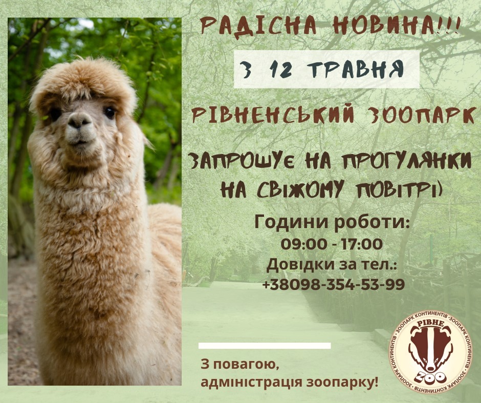 Як на мене, то дітвора найбільше чекала на зустріч зі своїми улюбленцями в зоопарку, адже зазвичай він відкриває сезон першого травня. Оскільки ціна квитка не змінилася, рівняни сім’ями виїздять сюди. Зоопарк займає 13,5 гектарів території, звірі тут перебувають у максимально наближених до природних умовах. Це просто чудовий відпочинок на природі, за яким усі неймовірно скучили! Щоправда, можливості скористатися дитячими майданчиками чи купити морозиво поки що немає. Головне, що тепер можна сповна відчути простір, за яким дуже скучили, та досхочу надихатися свіжим повітрям. Дарма, що все це треба робити в масках і на відстані півтора метри одне від одного.