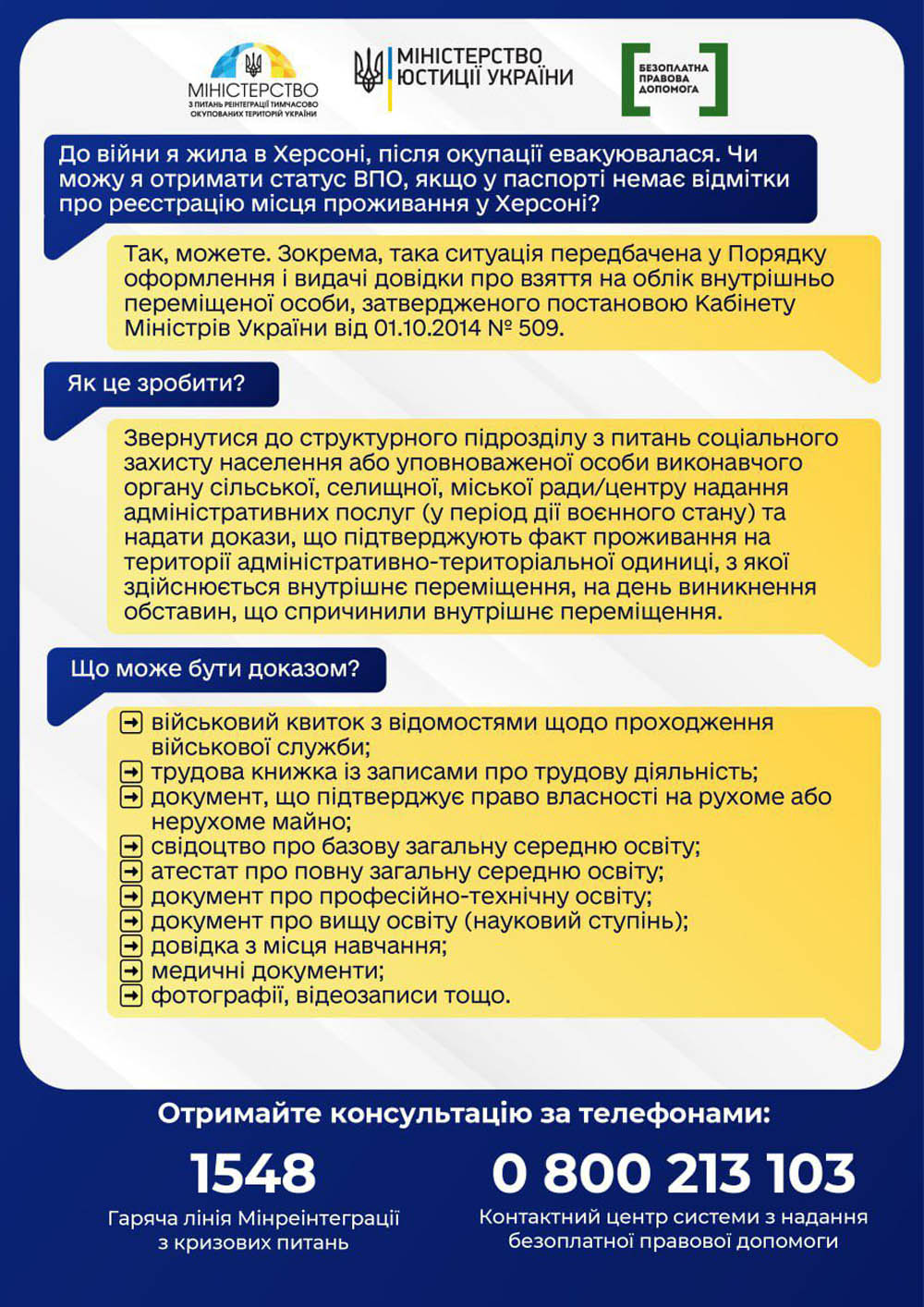 Статус внутрішньо переміщеної особи можна отримати і без офіційної реєстрації місця проживання на тимчасово окупованих територіях України. Це можна зробити після евакуації у разі наявності документів, які підтверджують факт проживання там. Про це повідомляє Урядовий портал.