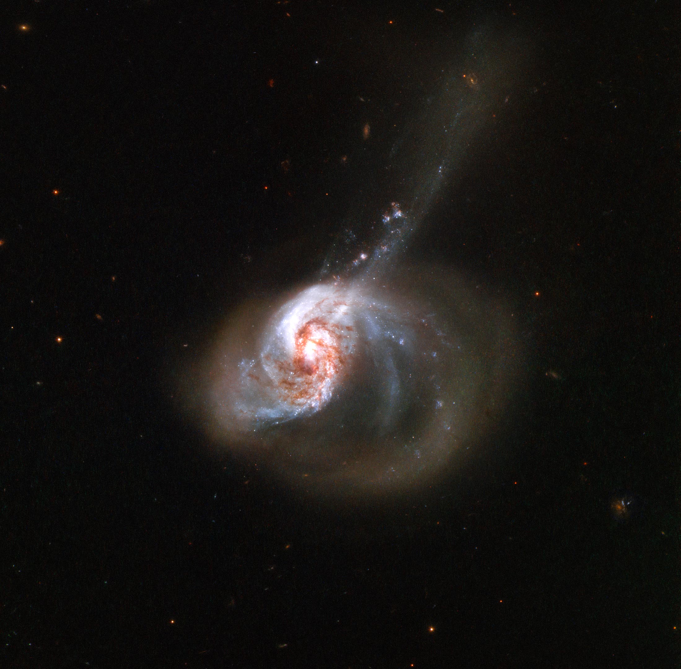 Космічним телескопом Хаббл NASA/ESA сфотографував галактику NGC 1614 ексцентричної форми, яка палає від активності. Галактика знаходиться приблизно в 200 мільйонах світлових років від Землі і розташована в південному сузір'ї Ерідана (річки).