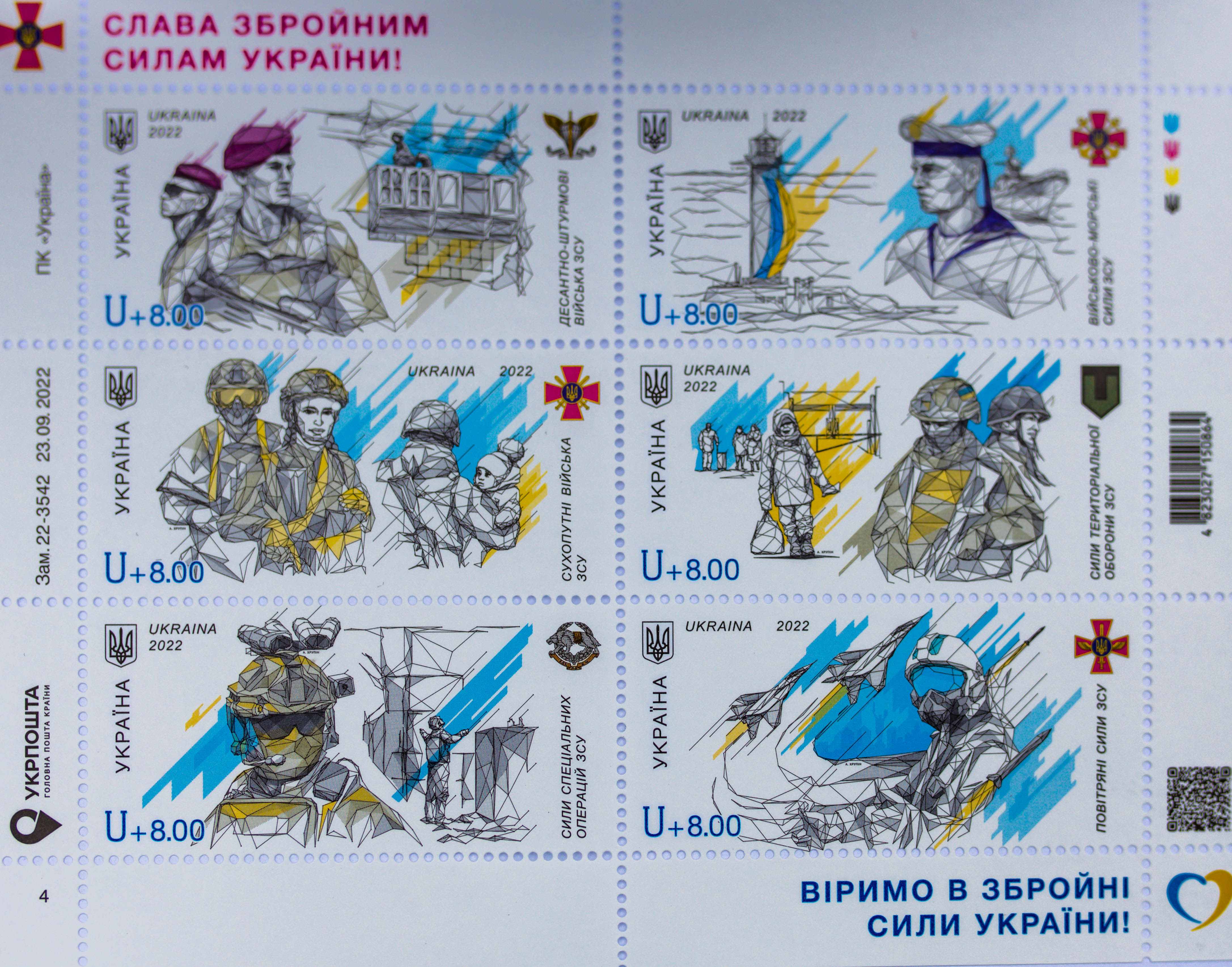 У новому блоці – 6 марок. На них – військовослужбовці ЗСУ. А ще – легендарний Привид, шафка, що тримається, величезний прапор на Воронцовському маяку.