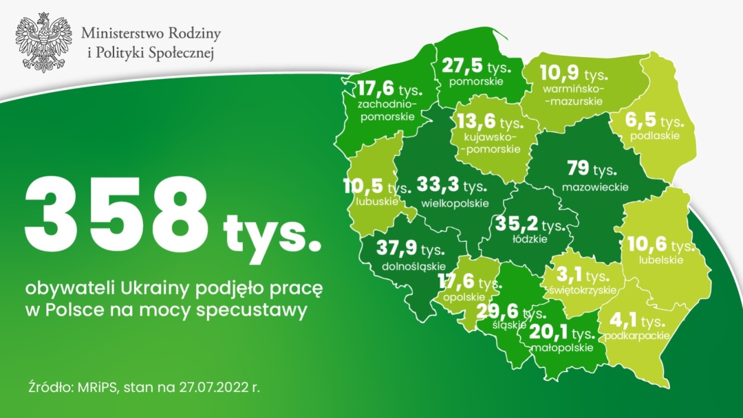 Як зазначається, найбільше українців знайшли роботу в Мазовецькому воєводстві (центр - Варшава) – 79 тис. Серед лідерів також воєводства Нижньосілезьке (Вроцлав) – 37,9 тис., Лодзьке – 35,2 тис. та Великопольському (Познань) – 33,3 тис.