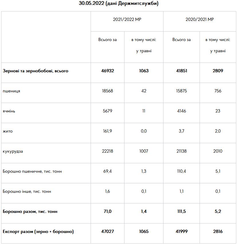 Так, з початку 2021/2022 МР Україна експортувала 46,93 млн тонн зернових та зернобобових, з них у травні — 1,06 млн тонн, зокрема: