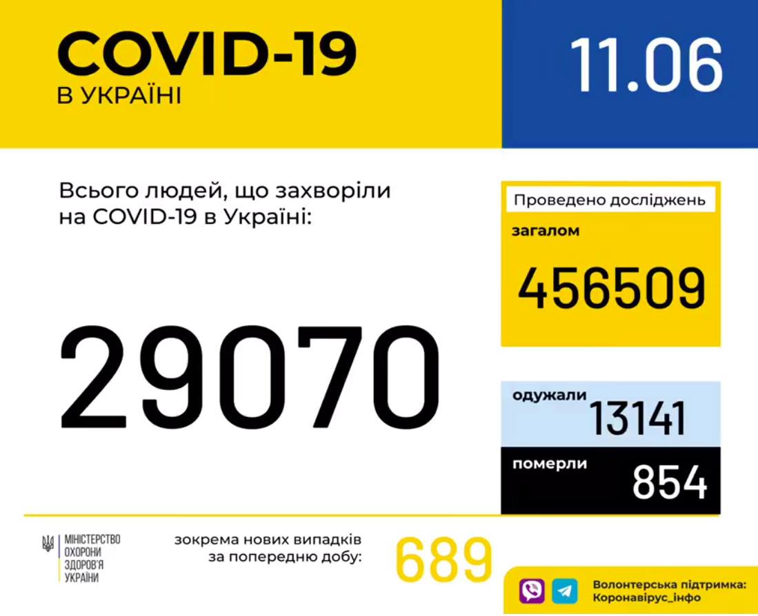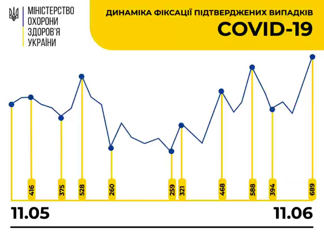 Упродовж минулої доби в Україні зареєстровано 689 нових випадків COVID-19, серед них 19 дітей, 65 медичних працівників. Було проведено 18 692 тести, з них 10 569 — ПЛР-тестування, решта — ІФА-тестування.