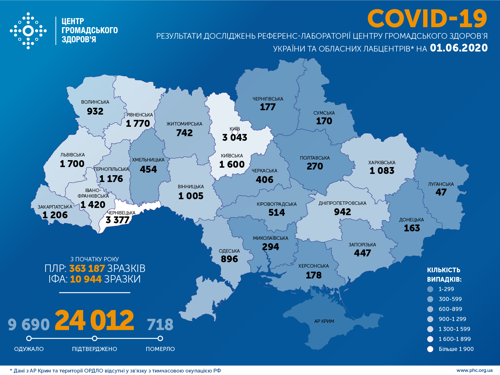 Загалом за час пандемії на коронавірус захворіло 24012 людей, з них 1725 – діти, 4621 – медичний працівник. Одужало 9690 осіб. Померло – 718 людей.