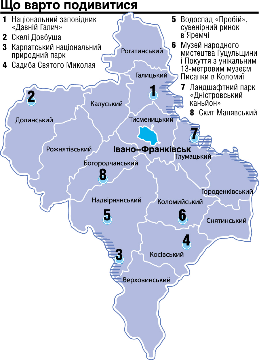 ВІЗИТІВКА. Івано-Франківщина — одна з наймолодших областей (утворена в грудні 1939 року) і найдревніших регіонів України. Багаті надра та природа, яку напувають п’ять річок — Дністер, Прут, Черемош, Свіча і найчистіша в Європі Лімниця, де поєдналися чорноземи Покуття, передгір’я Опілля і мальовничі Карпати, сприяють розвитку різних галузей сільського господарства і промисловості. Тут творять свою самобутню культуру гуцули, ополяни та бойки. Область є першою в Україні за кількістю музеїв — приватних, родинних, державних, третьою за кількістю пам’яток природи, історії та містобудування, входить у п’ятірку найпривабливіших туристичних регіонів країни. Прикарпаття може водночас прийняти до 2 млн гостей в сотнях сучасних готелів, 10 санаторіях і баз відпочинку, в 683 сертифікрваних зелених садибах.