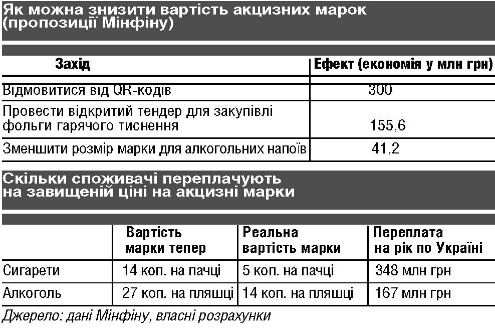 Утім, місяць минув — проекту як не було, так і немає, а покупці підакцизної продукції продовжують переплачувати приватним фірмам, залученим до виготовлення акцизних марок, шалені кошти. За підрахунками Мінфіну, які містяться в офіційному листі міністра фінансів Олександра Шлапака на ім’я голови Державної фіскальної служби України Ігоря Білоуса, через завищені ціни на акцизні марки «виробники і споживачі акцизної продукції змушені додатково переплачувати 515 мільйонів гривень на рік» (в середньому 43 мільйони гривень у місяць).