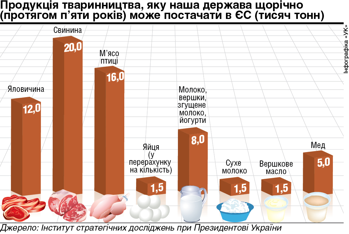 Європейська спільнота надає можливість безмитного «в’їзду» наших товарів на свою територію, враховуючи квотування. За інформацією Інституту стратегічних досліджень НАН України, наша держава щорічно може постачати такої продукції тваринного походження (наступні 5 років): 12 тисяч тонн яловичини, 20 тисяч тонн свинини, 16 тисяч тонн м’яса птиці, 1,5 тисячі тонн яєць (у перерахунку на кількість), 8 тисяч тонн молока, вершків, згущеного молока та йогуртів, 1,5 тисячі тонн сухого молока, 1,5 тисячі тонн вершкового масла, 5 тисяч тонн меду. Після цього терміну (5 років) квоти будуть значно збільшені.