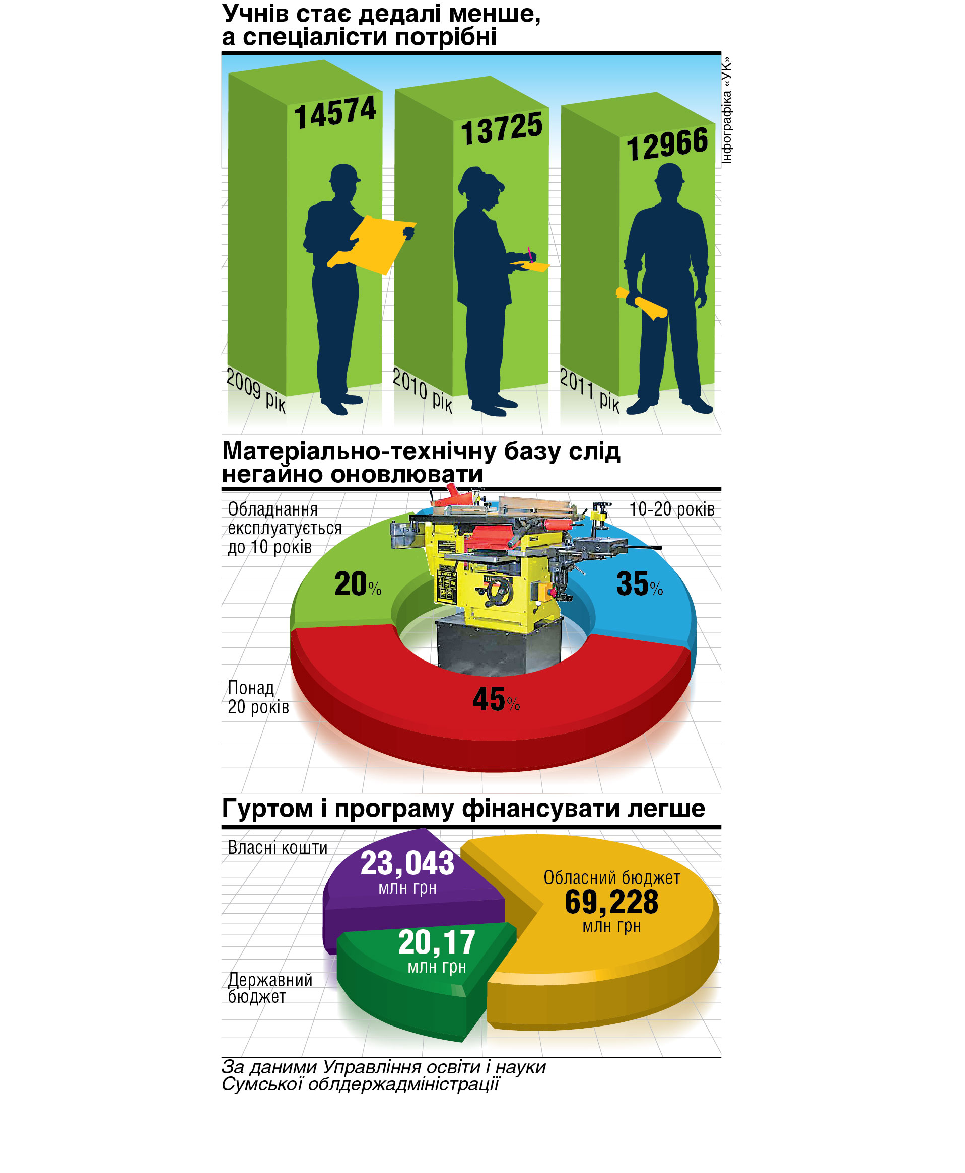 Перелік негараздів і проблем можна продовжувати, але від цього ситуація не поліпшиться. Головне — підвести під програму фінансову базу, яка б гарантувала практичні зміни на означених ділянках. За попередніми підрахунками, для реалізації наміченого потрібно 112 мільйонів гривень. З них із державного бюджету — 20,2, обласного — майже 70, власних коштів закладів ПТО — понад 23 мільйони гривень.