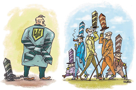 На виставці зібрані карикатури, на яких зображені дві реальності — українська і європейська. Карикатури були створені відомими українськими художниками: Мариною Туровською, Костянтином Казанчевим, Ігорем Бежуком та Олексієм Кустовським на замовлення Інституту світової політики.
