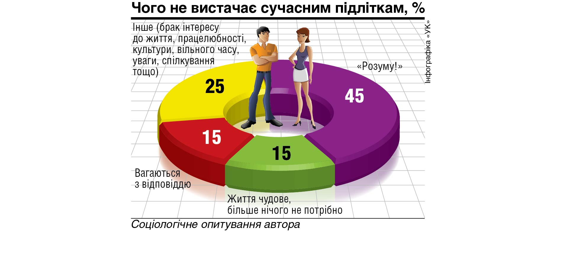 На запитання «Чого не вистачає, на ваш погляд, сучасній молоді?» із 40 респондентів 45% найтиповіших її представників (може, трохи жартома) відповіли: «Розуму!» Ще 15% певні, що життя в них і так чудове, більше їм нічого не потрібно. Стільки само молодих людей вагалися з відповіддю. У решти виникали найрізноманітніші варіанти: брак інтересу до життя, працелюбності, культури, вільного часу, уваги, спілкування, розуміння, відвертості та вірності — і це далеко не весь перелік.