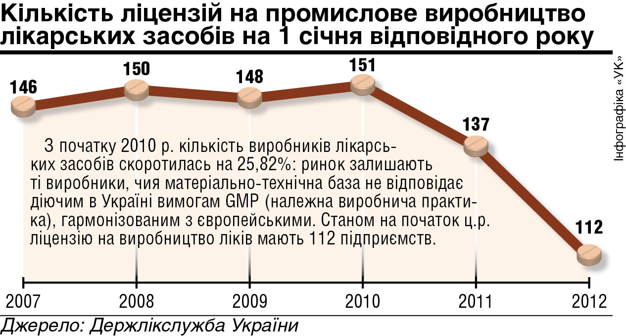 Що ж до вітчизняних виробників, то для них ця норма набула чинності з 2010 року. І на сьогодні 25% виробників — ті, які не змогли задовольнити вимоги GMP, тобто належної виробничої практики, — пішли з ринку. Тому й кількість ліцензіатів у нас зменшилася зі 153 до 112.