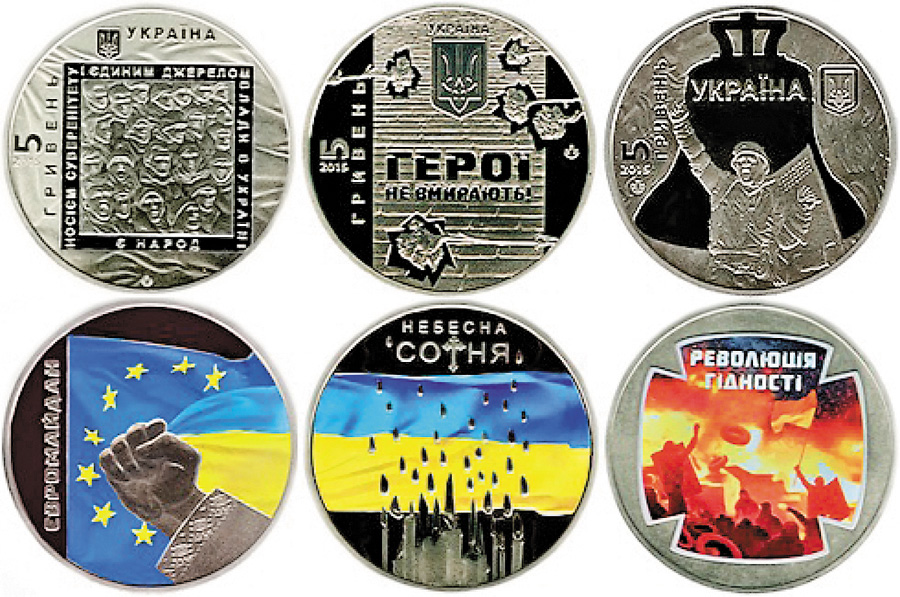 Національний банк України з 18 лютого ввів у обіг три пам’ятні монети, присвячені трагічним подіям, що вирували в нашій країні в листопаді 2013 — лютому 2014 року. Монети «Євромайдан», «Небесна Сотня» та «Революція гідності» виготовлені з нейзильберу (сплаву міді, цинку та нікелю), тираж кожної з них — 50 тисяч екземплярів, номінал монет — 5 гривень.