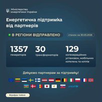 Протягом січня — березня в Україну надійшло понад 2 тисячі одиниць енергетичного обладнання. Це генератори, трансформатори, блочномодульні котельні, когенераційні установки, котли тощо. Допомогу надали партнери з ЄС, Німеччини, Литви, Латвії, Словаччини, Австрії, Естонії, Франції, Японії, Молдови, Азербайджану, Норвегії, Швеції, Італії, Бельгії, Чехії, Данії, Польщі, Кіпру, Швейцарії, UNICEF/WASH, Нідерландів, PFRU, Фінляндії.