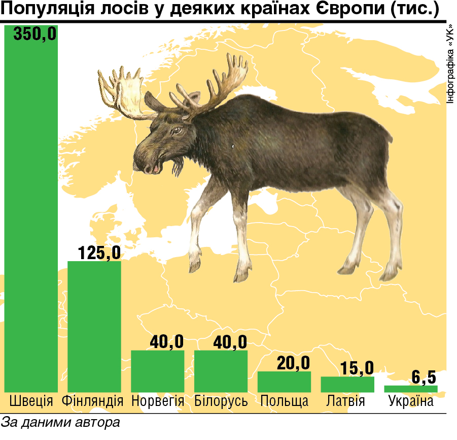 Подивімося, скільки лосів у деяких інших європейських країнах (усі вони менші за Україну за площею): Фінляндія — 125 тисяч, Норвегія — 40, Швеція — 350 тисяч. Спеціалісти одразу скажуть, що так і має бути. Адже Скандинавський півострів — це так зване ядро ареалу лося, там для нього найкращі умови. Але ж у сусідів (усі вони за площею так само менші за Україну) теж чимало цих тварин. За даними доктора біологічних наук Олексія Данілкіна, у Польщі — 20 тисяч, Білорусі — до 40, Латвії — 15 тисяч.